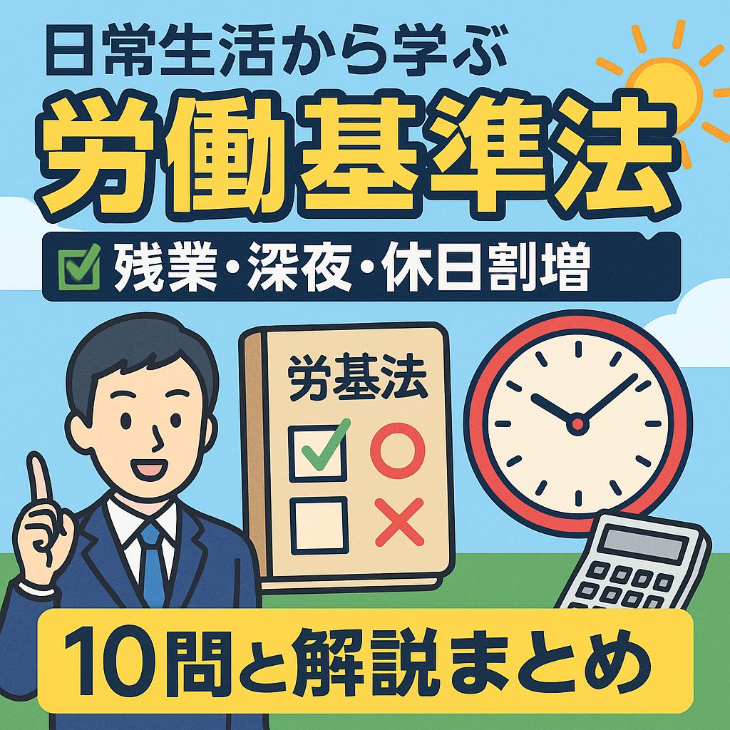 今回は、労働基準法の中でも日常生活に最も密接な「時間外労働・深夜割増・休日労働」について、10問の問題と解説をまとめました。